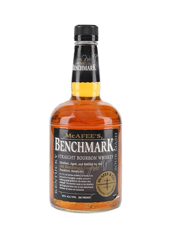 A bottle of McAfee's Benchmark Kentucky Straight Bourbon Whiskey, distilled, aged and bottled by Old Benchmark Company.