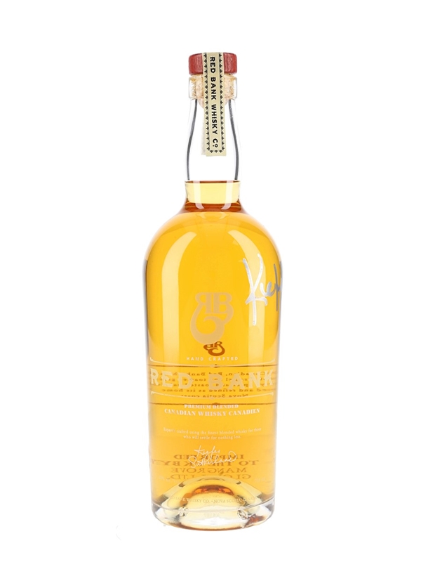 A bottle of Red Bank Premium Blended Canadian Whisky, signed by co-founder Kiefer Sutherland.