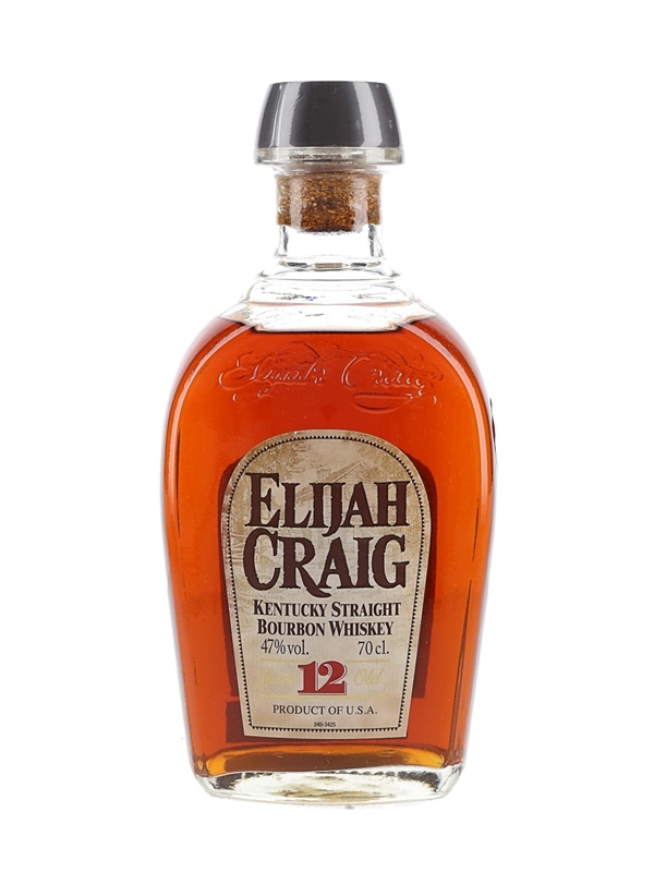 A bottle of Elijah Craig 12 Year Old Kentucky Straight Bourbon Whiskey bottled at 47% ABV.