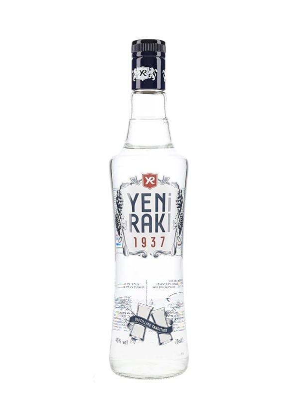 A bottle of Yeni Raki, a Turkish liqueur made with grape distillate flavoured with anise.