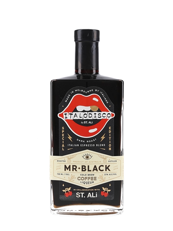 A bottle of Mr Black Cold Brew Coffee Liqueur, Made in Melbourne by Italians. This was produced in collaboration with ST. Ali for Italodisco.