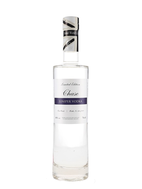 A bottle of Chase Juniper Vodka, produced in Herefordshire, England.