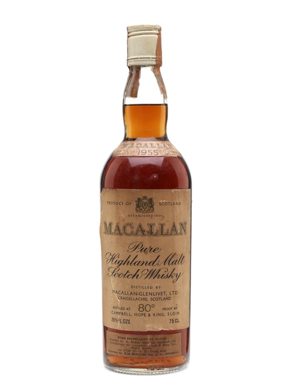 A bottle of The Macallan 1955, bottled by Campbell, Hope & King. This was bottled for the Italian market and imported by Rinaldi, we estimate in the 1970s.
