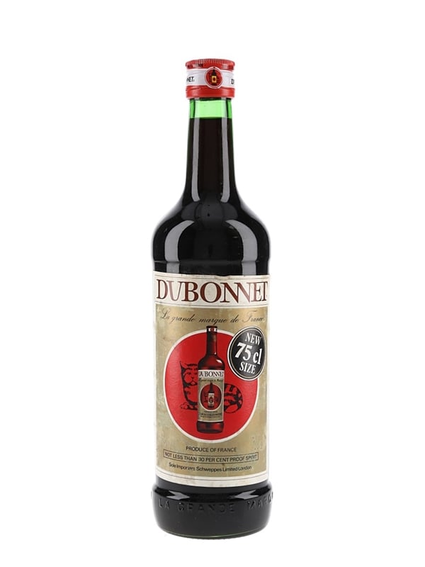 A bottle of Dubonnet Wine Aperitif, a fortified wine flavoured with herbs, spices, and quinine.