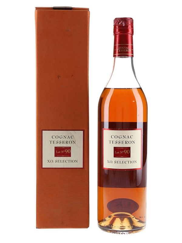 A bottle of Tesseron XO Exception Cognac Lot No.90. This is produced exclusively from grapes grown in the Grande Champagne region of Cognac.
