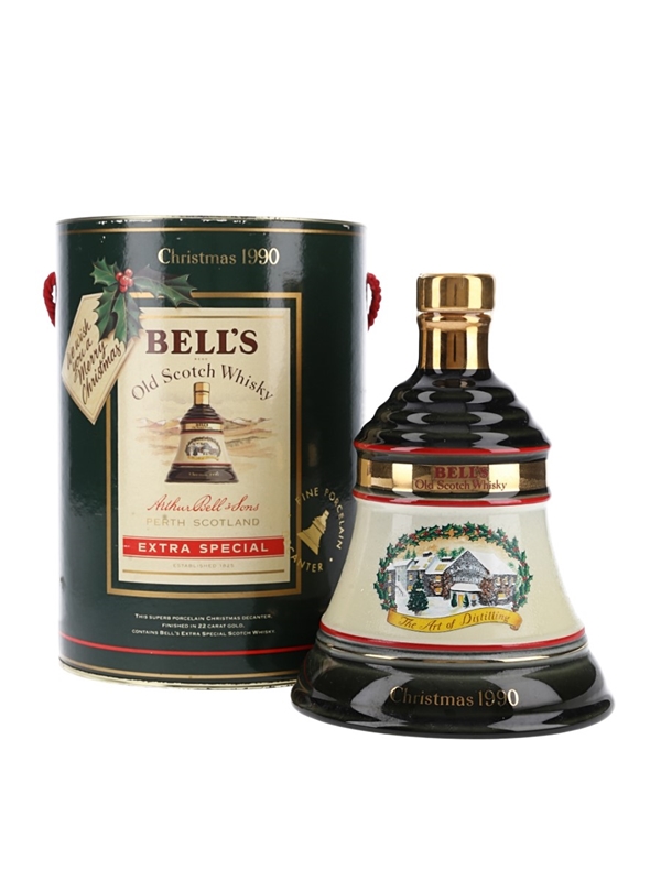 A bottle of Bell's Old Scotch Whisky presented in a ceramic decanter and released for Christmas 1990. The label depicts 'The Art of Distilling' with Blair Athol distillery blanketed in snow.