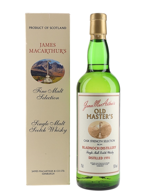 A bottle of Bladnoch Single Malt Scotch Whisky. This was distilled in 1991 bottled at a cask strength of 50% ABV in 2001 by James MacArthur's as a part of the Old Master's series.