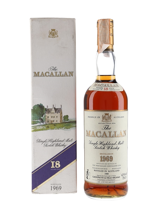 A bottle of The Macallan 18 Year Old Single Highland Malt Scotch Whisky. This was distilled in 1969, matured in sherry casks and bottled in 1988. This was imported to Italy by Giovinetti & Figli.