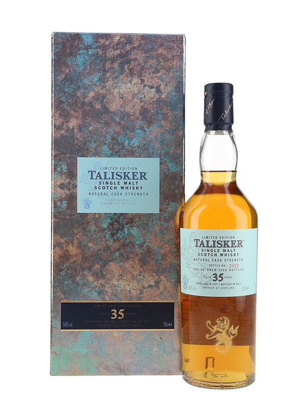 A limited edition bottle of Talisker 35 Year Old Single Malt Scotch Whisky. This was distilled in 1977, matured in a combination of refill American and European oak casks and bottled in 2012 for Diageo's Special Releases series.
