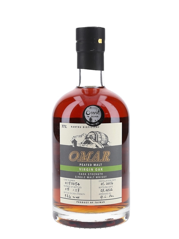 A bottle of Nantou Omar Virgin Oak Cask Single Malt Whisky. This was distilled in January 2016, matured in a virgin oak cask and bottled at 53.6% ABV in March 2022.