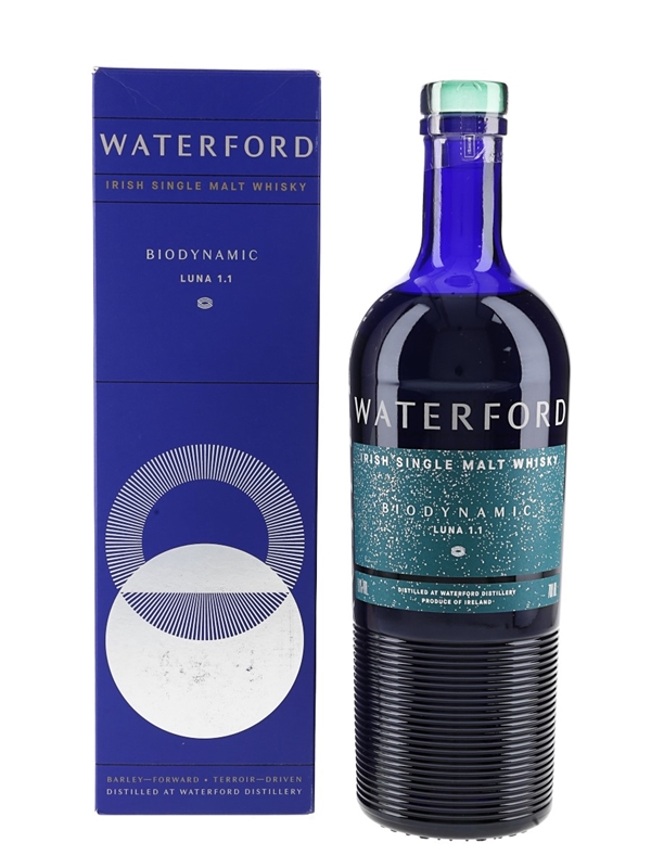 A bottle of Waterford Luna 1.1 Biodynamic Irish Single Malt Whisky, the world’s first whisky made from biodynamic barley. The barley for this whisky was harvested in summer 2017. This was distilled in 2018, matured for 3 years, 2 months, 1 day and bottled at 50% ABV on 3 September 2021 as part of the Arcadian Series.