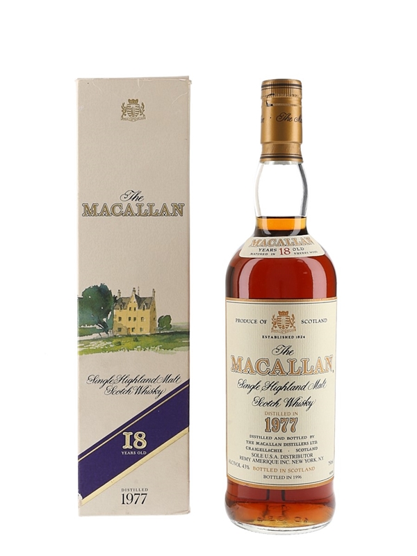 A bottle of The Macallan 18 Year Old Single Highland Malt Scotch Whisky. This was distilled in 1977, matured in sherry casks and Bottled in 1996 at 43% ABV. This was imported to the US market by Remy Amerique INC.