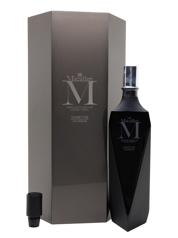 The 2018 release of The Macallan M Black Highland Single Malt Scotch Whisky, presented in a black Lalique crystal decanter and a mirrored presentation box. This edition in the Master Decanter Series is a collaboration between The Macallan distillery, designer Fabien Baron and renowned French glassmaker Lalique.
