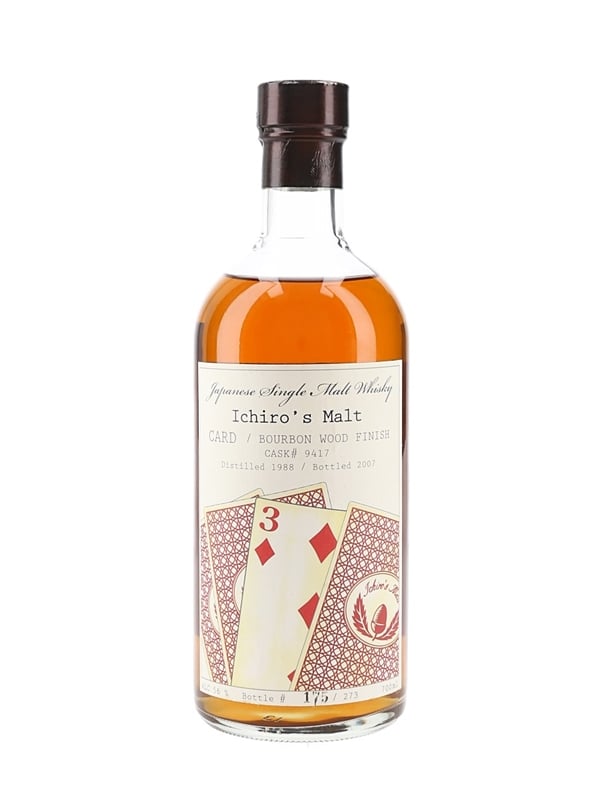 A bottle of Hanyu 1988 Japanese Single Malt Whisky, the three of diamonds in the Ichiro's Malt Card series. This was distilled in 1988, finished in a Bourbon Oak Cask before bottling at cask strength in 2007.