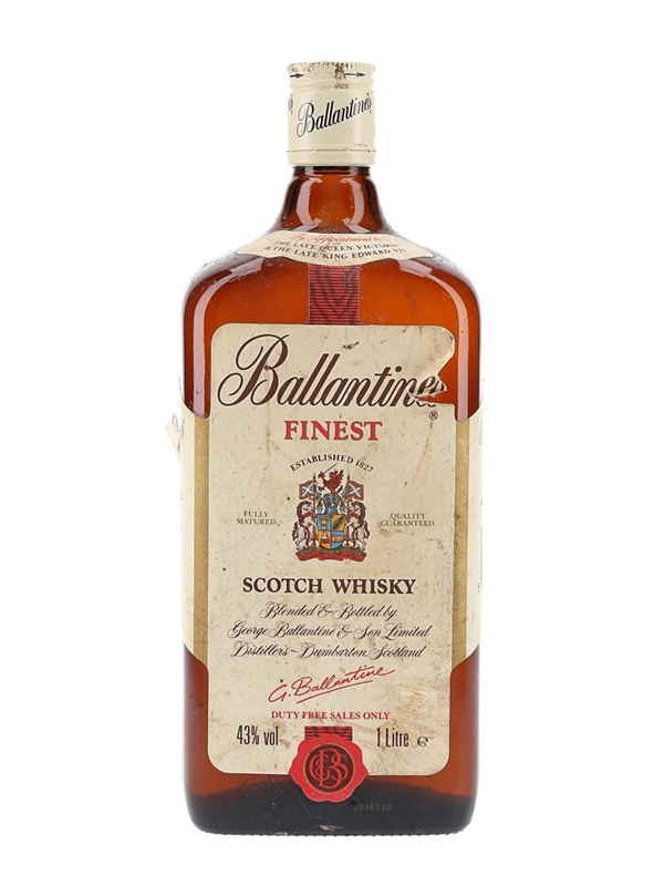 A litre bottle of Ballantine's Finest Scotch Whisky, produced by George Ballantine & Son Limited. We estimate this was bottled in the 1980s.