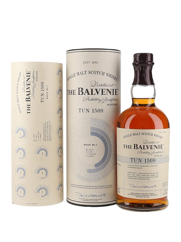 A bottle of the first batch of The Balvenie Tun 1509 Single Malt Scotch Whisky. This is a vatting of malts matured in traditional whisky casks and sherry butts, and all married together in Tun 1509 by Malt Master David Stewart. This includes a chart describing the flavour profiles of the different cask types.