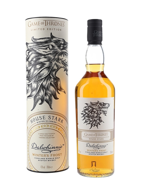 A limited edition bottle of Dalwhinnie Winter's Frost Highland Single Malt Scotch Whisky from Diageo's Game of Thrones series. Each of the nine bottles in the series is named for one of the Great Houses of Westeros and The Night's Watch. This edition represents House Stark.