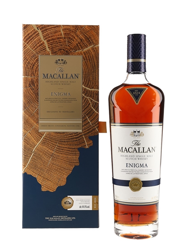 A bottle of The Macallan Enigma Highland Single Malt Scotch Whisky. This travellers exclusive release was aged in sherry seasoned European oak butts and hogsheads from Jerez de la Frontera, Spain.