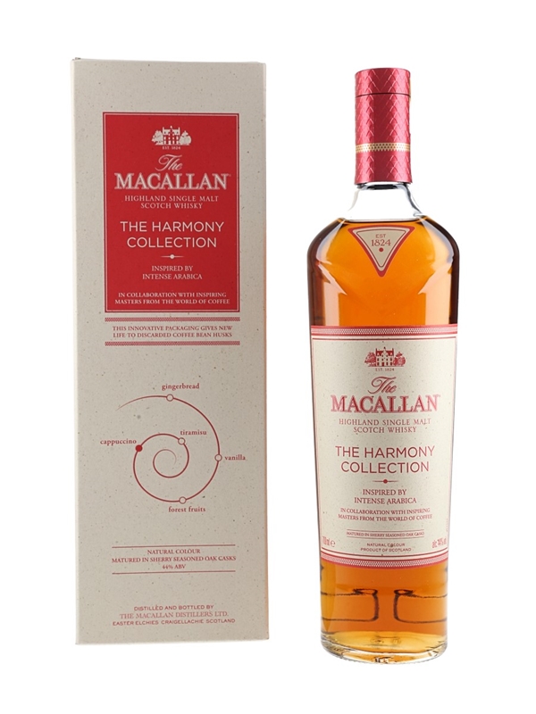 A bottle of The Macallan Intense Arabica Highland Single Malt Scotch Whisky from The Harmony Collection. This is inspired by the Ethiopian Arabica bean, in collaboration with inspiring masters from around the world of coffee.