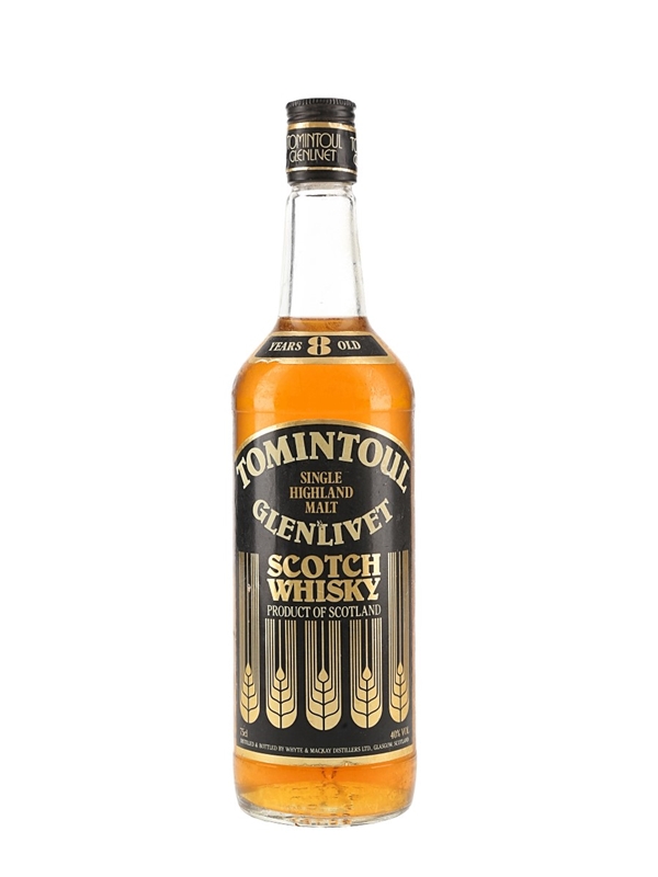 A bottle of Tomintoul Glenlivet 8 Year Old Single Highland Malt Scotch Whisky. This was produced and bottled by Whyte & Mackay, we estimate in the 1980s.