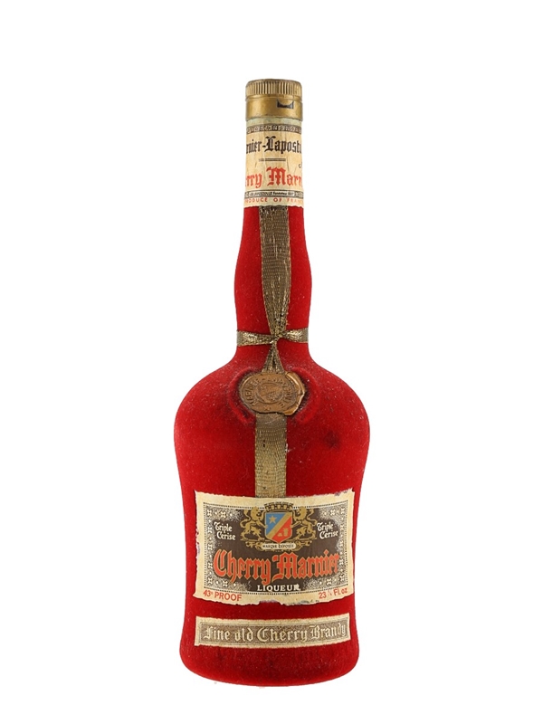 A 66cl bottle of Cherry Marnier, a cherry brandy liqueur from Marnier-Lapostolle. This bottle is covered in a velvet-effect coating. We estimate this was bottled in the 1970s.