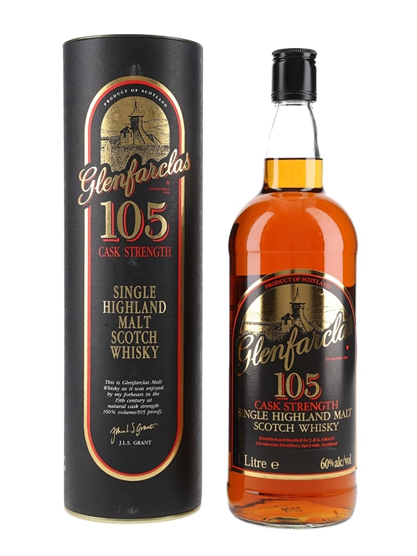 A litre bottle of Glenfarclas 105 Cask Strength Single Highland Malt Scotch Whisky. We estimate this was bottled in the 1990s.