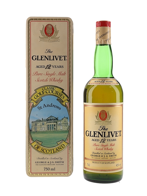 A bottle of The Glenlivet 12 Year Old Pure Single Malt Scotch Whisky, distilled in Scotland by George & J.G.Smith. This is from the Classic Golf Courses range and features The Old Course at St Andrews on the presentation tin. We estimate this was bottled in the 1980s.