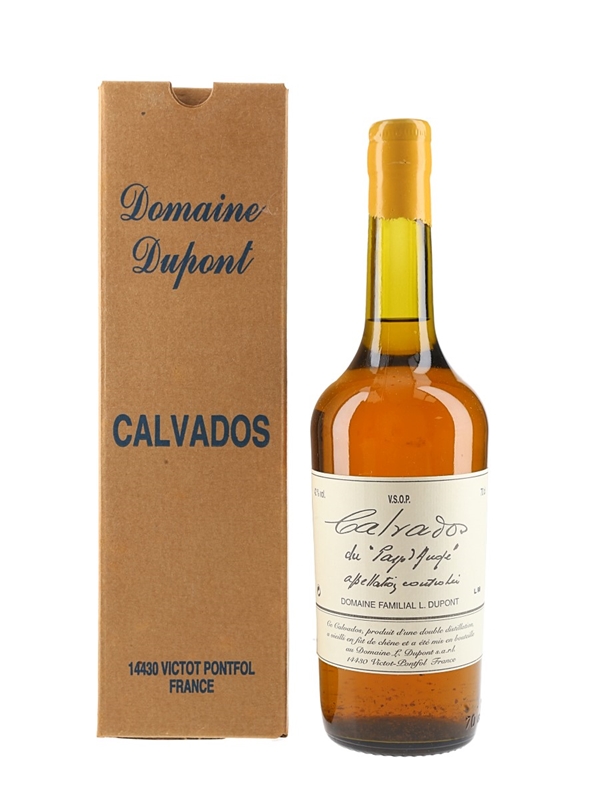 A bottle of Domaine Dupont VSOP Calvados bottled at 42% ABV in Domaine Familial L. Dupont, France.