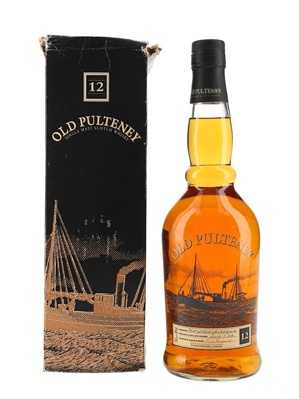 An old presentation bottle of Old Pulteney 12 Year Old Single Malt Scotch Whisky with a screen printed label. We estimate this was bottled in the 2000s, before 2013 when Wolfburn took the title of 'Scotland's most northerly mainland distillery' from Old Pulteney.