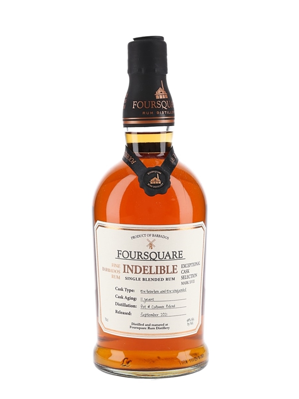 A bottle of Foursquare Indelible 11 Year Old Fine Barbados Single Blended Rum. This was matured in a combination of ex-bourbon and ex-Zinfandel casks for 11 years, bottled at 48% ABV and released in September 2021 for Exceptional Cask Selection Mark XVIII.