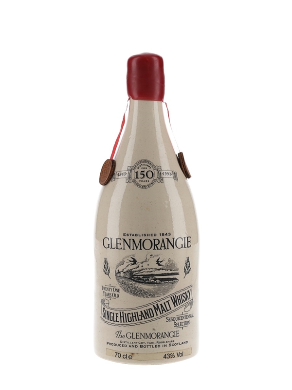 A ceramic bottle of Glemorangie 21 Year Old Sesquicentennial Selection Single Highland Malt Whisky. This was bottled in 1993 to celebrate the 150th anniversary of the founding of the distillery in 1843.
