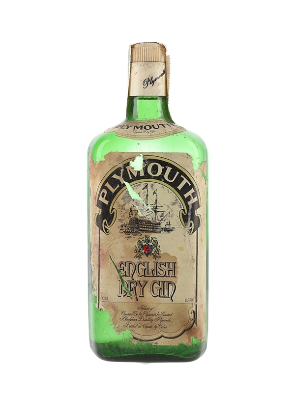 A litre bottle of Plymouth English Dry Gin from Coates & Co., bottled in Spain by Celsa, we estimate in the 1970s.