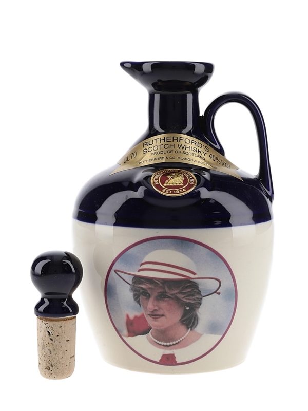 A bottle of Rutherford's blended Scotch whisky in a ceramic decanter featuring Princess Diana, produced by Montrose Pottery, we estimate in the 1980s.