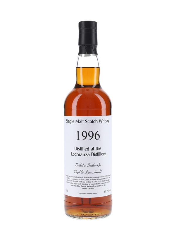 A private cask bottling of 1996 vintage single malt whisky produced at Lochranza distillery, Isle of Arran. This was distilled on 7 October 1996, matured in a single cask for more than 21 years, and bottled in April 2018 at natural cask strength.