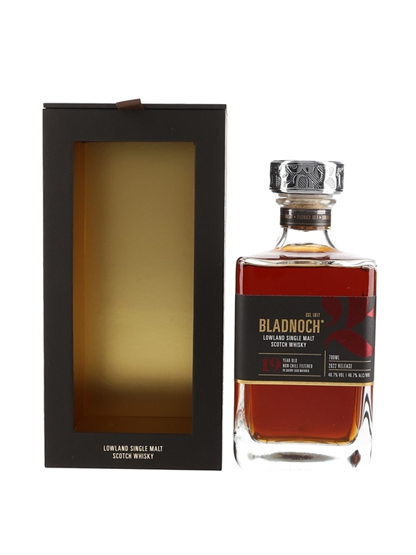 A bottle of Bladnoch 19 Year Old Lowland Single Malt Scotch Whisky. Matured in PX Sherry