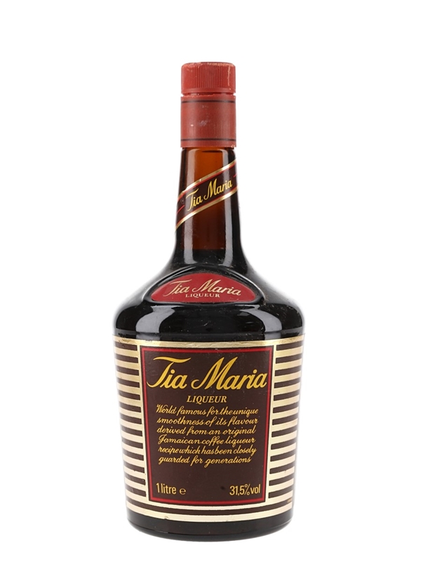A litre bottle of Tia Maria, a Jamaican coffee liqueur produced by Tia Maria International Ltd., London, and bottled at 31.5% ABV. We estimate this was bottled in the 1980s to 1990s.