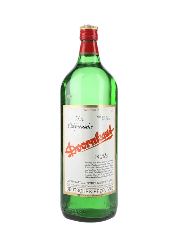 A bottle of Doornkaat schnapps from Germany, made from rye, wheat and malt. This was bottled for duty free sale.
