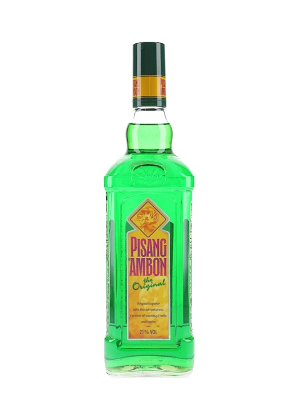 A litre bottle of Pisang Ambon The Original flavoured liqueur with banana produced in the Netherlands.