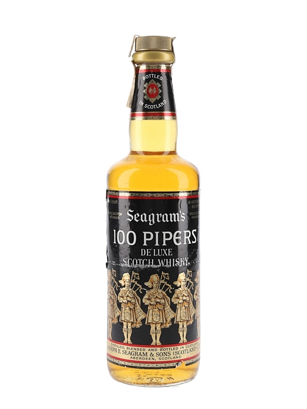 A bottle of Seagram's 100 Pipers De Luxe Scotch Whisky, produced and bottled by Joseph E Seagram & Sons Ltd. We estimate this was bottled in the 1970s.