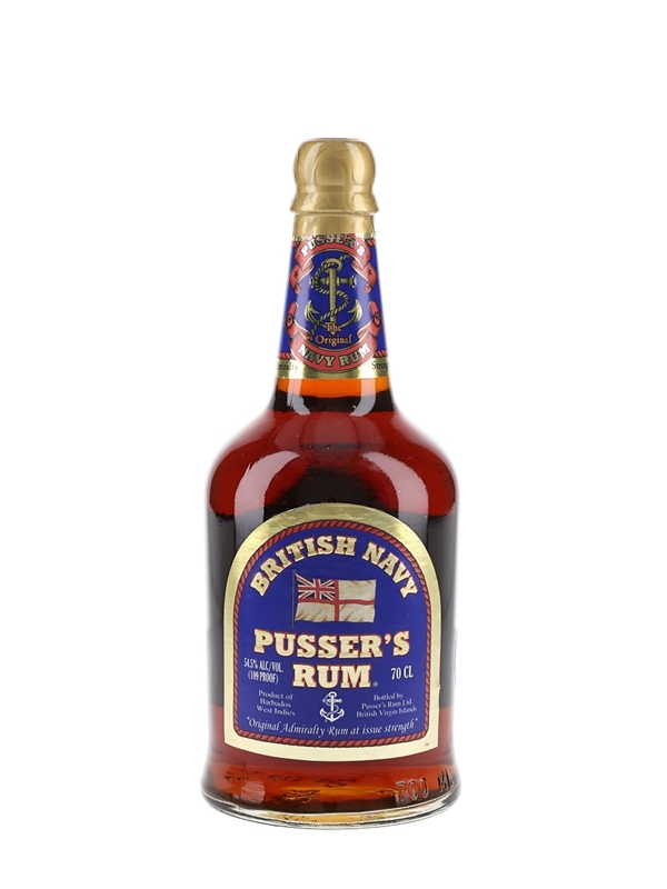 A bottle of Pusser's British Navy Rum, produce of Guyana, Trinidad, and the British Virgin Islands. This was imported to the UK by Malcolm Cowen Limited.