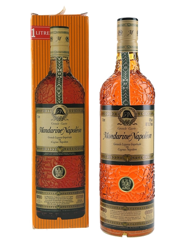 A litre bottle of Mandarine Napoléon Grande Liqueur Impèriale, a Cognac and orange liqueur produced in Belgium.