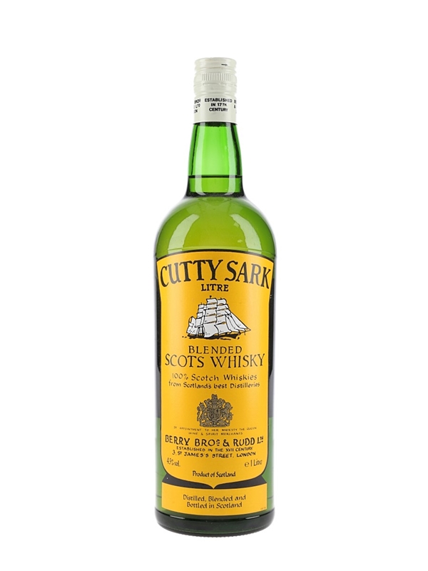 A litre bottle of Cutty Sark Blended Scots Whisky bottled by Berry Bros & Rudd. We estimate this was bottled in the 1980s.