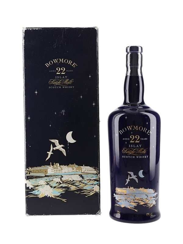 A bottle of Bowmore 22 Year Old Islay Single Malt Scotch Whisky, presented in a blue ceramic decanter. This expression was released in the 1990s.