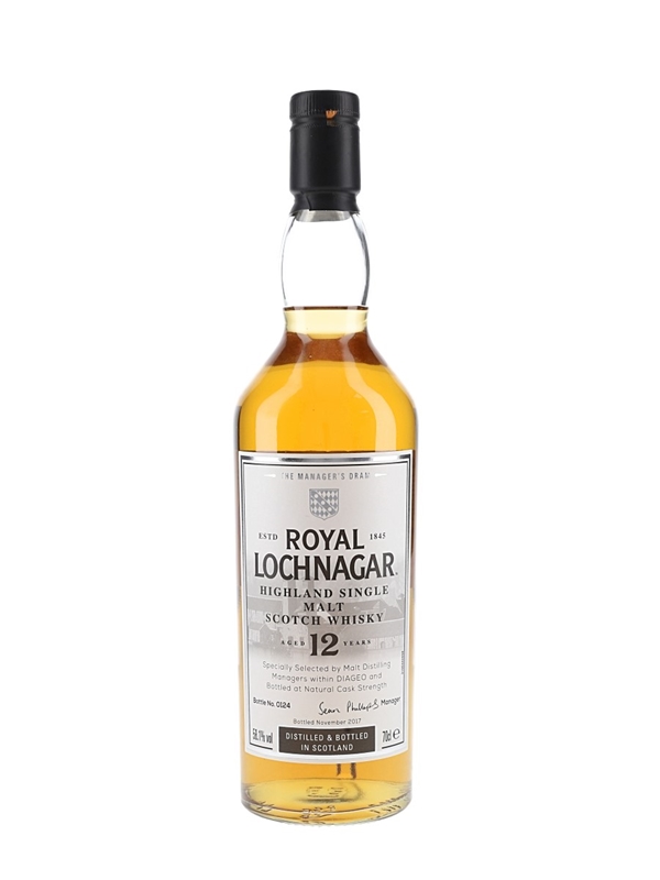 A bottle of Royal Lochnagar 12 Year Old Single Highland Malt Scotch Whisky, bottled at 58.1% ABV in November 2017. This was specially selected by distillery manager Sean Phillips as part of the Manager's Dram collection.
