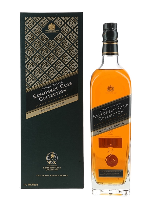 A litre bottle of Johnnie Walker Explorers' Club Collection Blended Scotch Whisky. The Gold Route is the second release from the Explorers' Club Collection and it was inspired by the Walker family's journeys from Central America and along the coast of the Pacific Ocean.