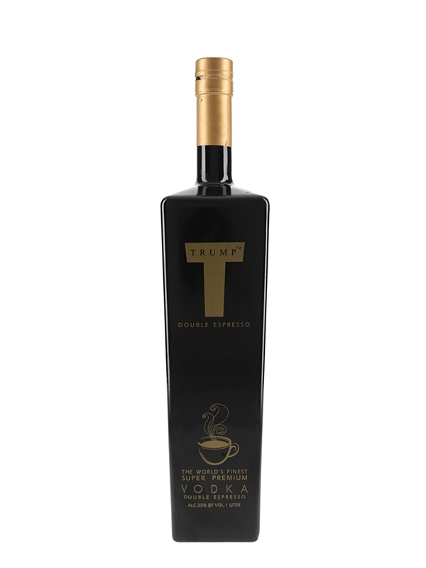 A litre bottle of Double Espresso flavored Trump Super Premium Vodka, an American brand of vodka made from European wheat by August Ernst in Germany and named after US President Donald Trump. Trump Vodka was launched in 2005 and was marketed with the tag line 'Success Distilled'. The product was discontinued in 2011.