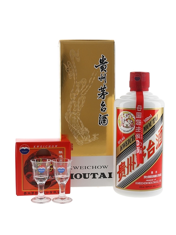 A 50cl bottle of Kweichow Moutai 2023 in a presentation box with two glasses.