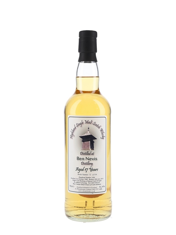 A bottle of Ben Nevis 17 Year Old Single Malt Scotch Whisky. This was distilled on 21 October 1996, matured in a single cask and bottled on 10 June 2014 at 51.4% ABV by Whiskybroker.