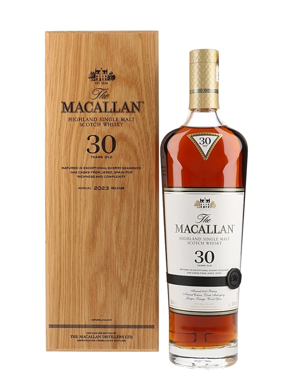 A bottle of The Macallan 30 Year Old Highland Single Malt Scotch Whisky, exclusively matured in sherry seasoned oak casks from Spain. This is the annual 2023 release.