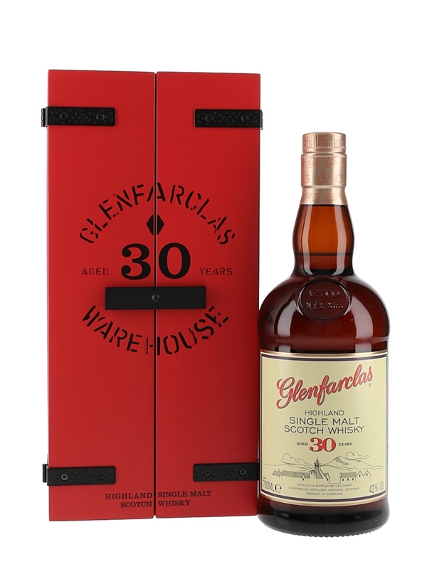A bottle of Glenfarclas 30 Year Old Highland Single Malt Scotch Whisky. This is presented in a box designed to pay homage to the distilleries red warehouse doors.